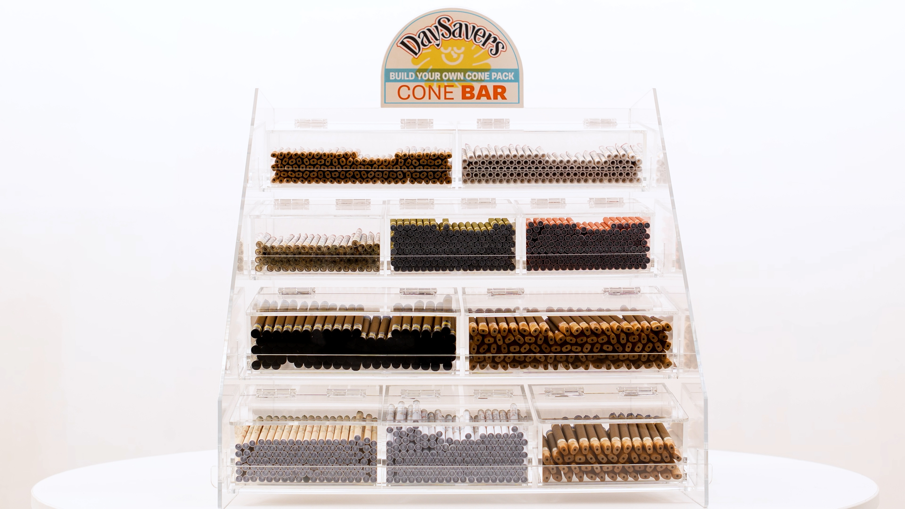 The DaySavers Cone Bar is re-inventing how customers shop for pre-rolled cones! With 10 different choices of pre-rolled cones and tubes, the DaySavers Cone Bar provides nearly endless “choose your own adventure” possibilities and allows your customers to Enjoy Their Day, their way.