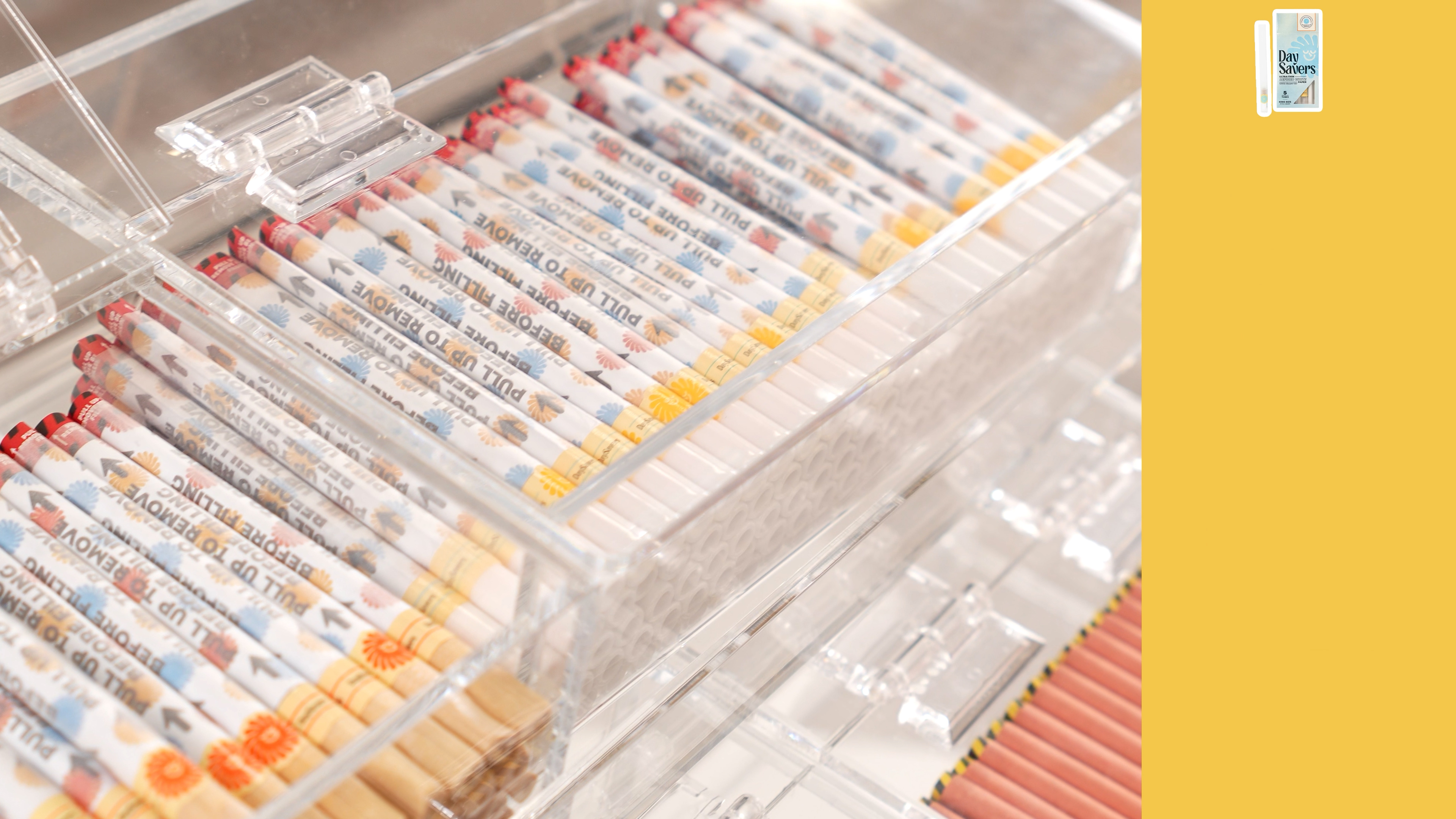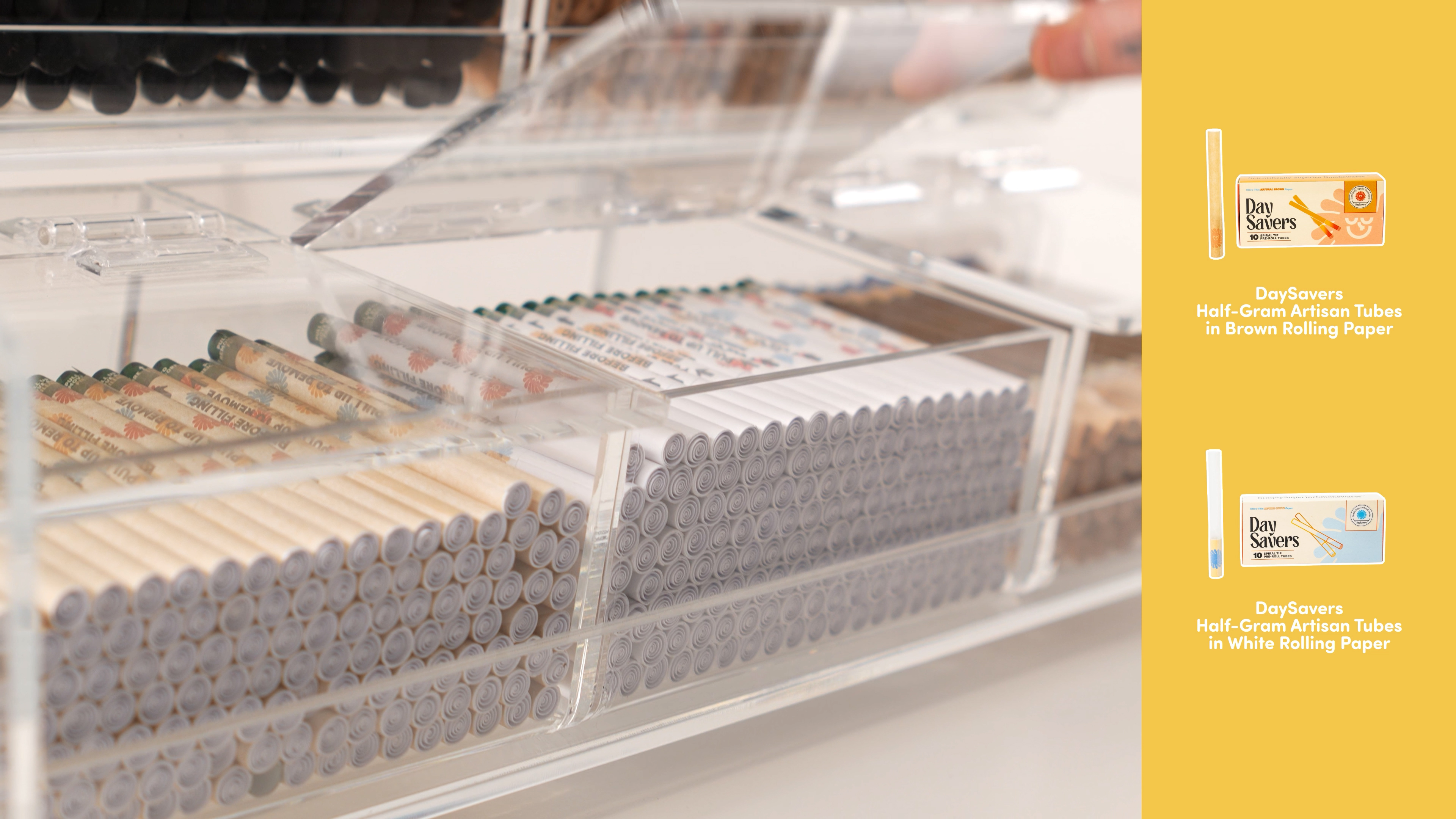 This eye-catching clear, acrylic countertop display has space for 10 different DaySavers options. Customers can shop for pre-rolled cones, tubes and blunts in their choice of paper, hemp wrap and our colorful hybrid hemp wraps that never dry out, with multiple filter tip options, from paper spiral and wood to smooth glass and premium ceramic that cools hits for a smooth, flavorful experience.